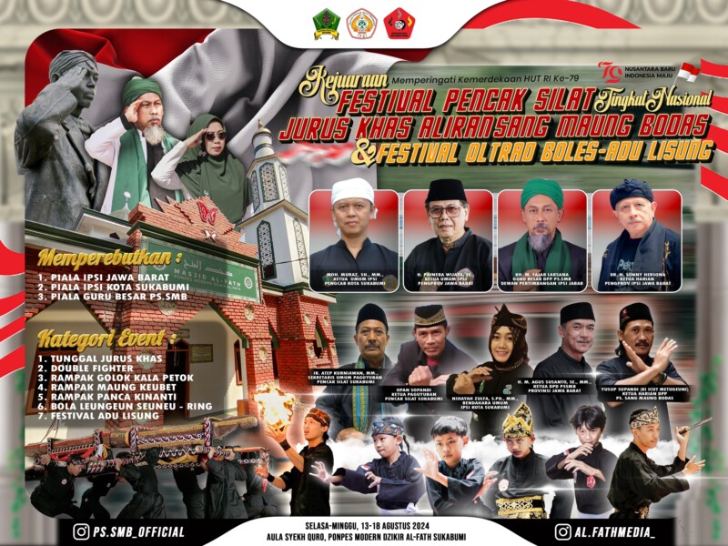 TEROPONG INDONESIA, KOTA SUKABUMI – Dalam rangka memperingati HUT Ke 79 Kemerdekaan Republik Indonesia, Perguruan Pencak Silat Sang Maung Bodas, menggelar Kejuaraan Pencak Silat Tingkat Nasional Jurus Khas Aliran Sang Maung Bodas dan Festival Oltrad Boles – Adu Lisung yang akan dilaksanakan mulai Hari Selasa – Minggu (13-18/08/2024), di Aula Syehk Quro, Ponpes Modern Dzikir Al Fath, Kota Sukabumi.