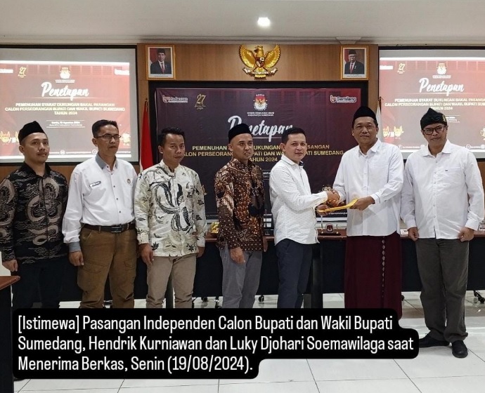 (TEROPONG INDONESIA)-, Komisi Pemilihan Umum (KPU) Kabupaten Sumedang pada Senin (19/08/2024) resmi menetapkan bahwa pasangan independen Hendrik Kurniawan dan Luky Djohari Soemawilaga telah memenuhi syarat dukungan untuk maju sebagai calon Bupati dan Wakil Bupati Sumedang tahun 2024. Penetapan ini dilakukan sesuai dengan Peraturan KPU Nomor 8 Tahun 2024 tentang Pencalonan Kepala Daerah.