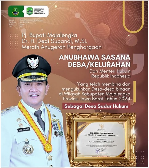 (TEROPONG INDONESIA)-, Baru saja memasuki hari ketiga di bulan Desember, Penjabat Bupati Majalengka meraih penghargaan Anubhawa Sasana Desa/Kelurahan.