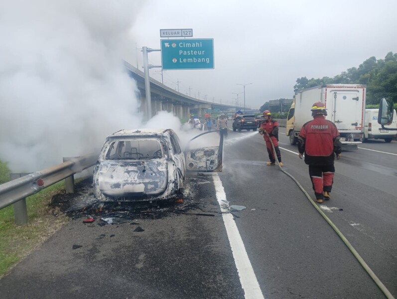 Teropong Indonesia, KOTA CIMAHI – Sebuah mobil Honda Mobilio bernomor polisi D 1323 AJM terbakar di Jalan Tol Padalarang–Cileunyi KM 126, tepatnya di wilayah Kelurahan Leuwigajah, Kecamatan Cimahi Selatan, pada Senin (9/2/2026) siang. Beruntung, empat orang penumpang berhasil menyelamatkan diri tanpa mengalami luka.